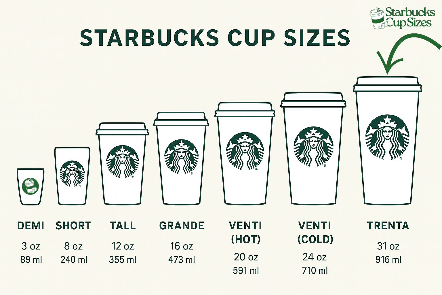 | Trenta | 31 oz | 916 ml | 3 shots (optional) | Extra-large cold beverage; perfect for long-lasting refreshment, volume, and full customization |